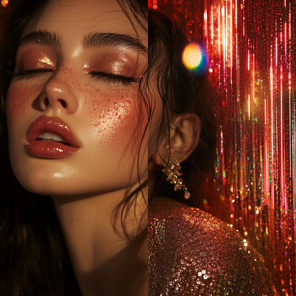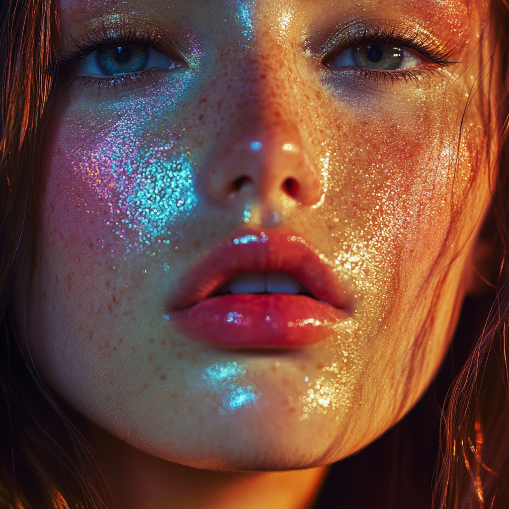 gloss, sparkle, oil-slick reflections, neon warmth,