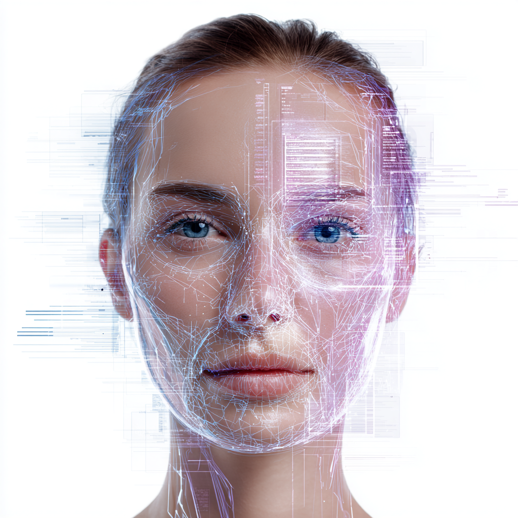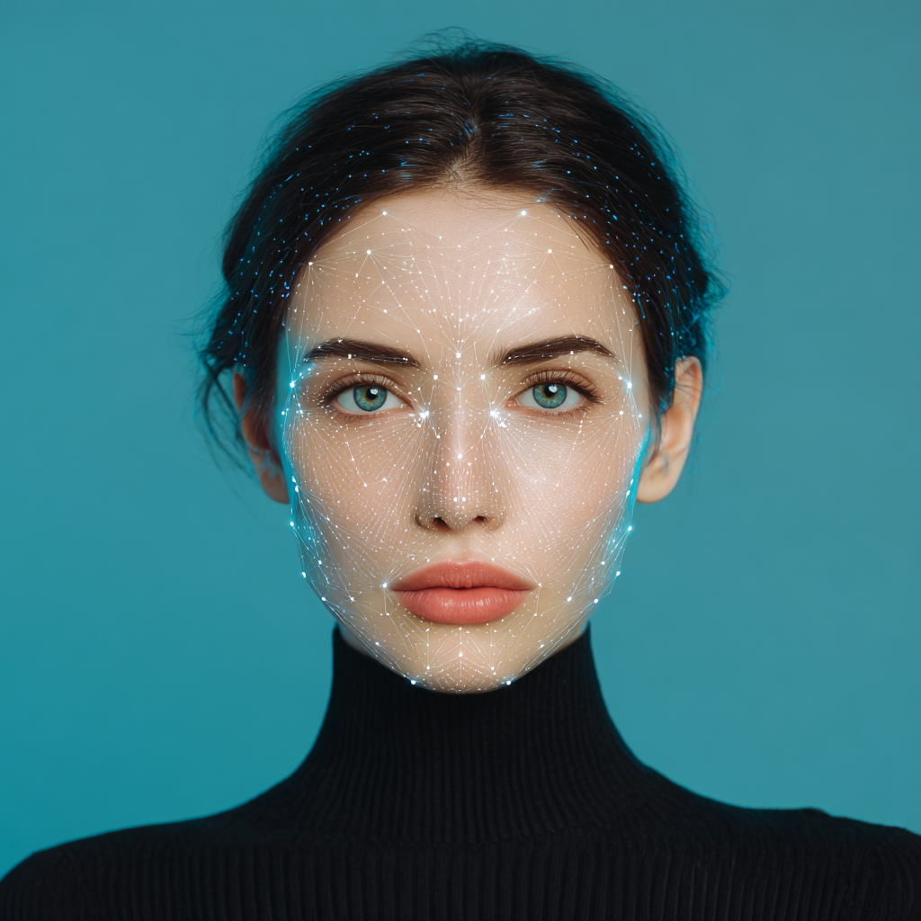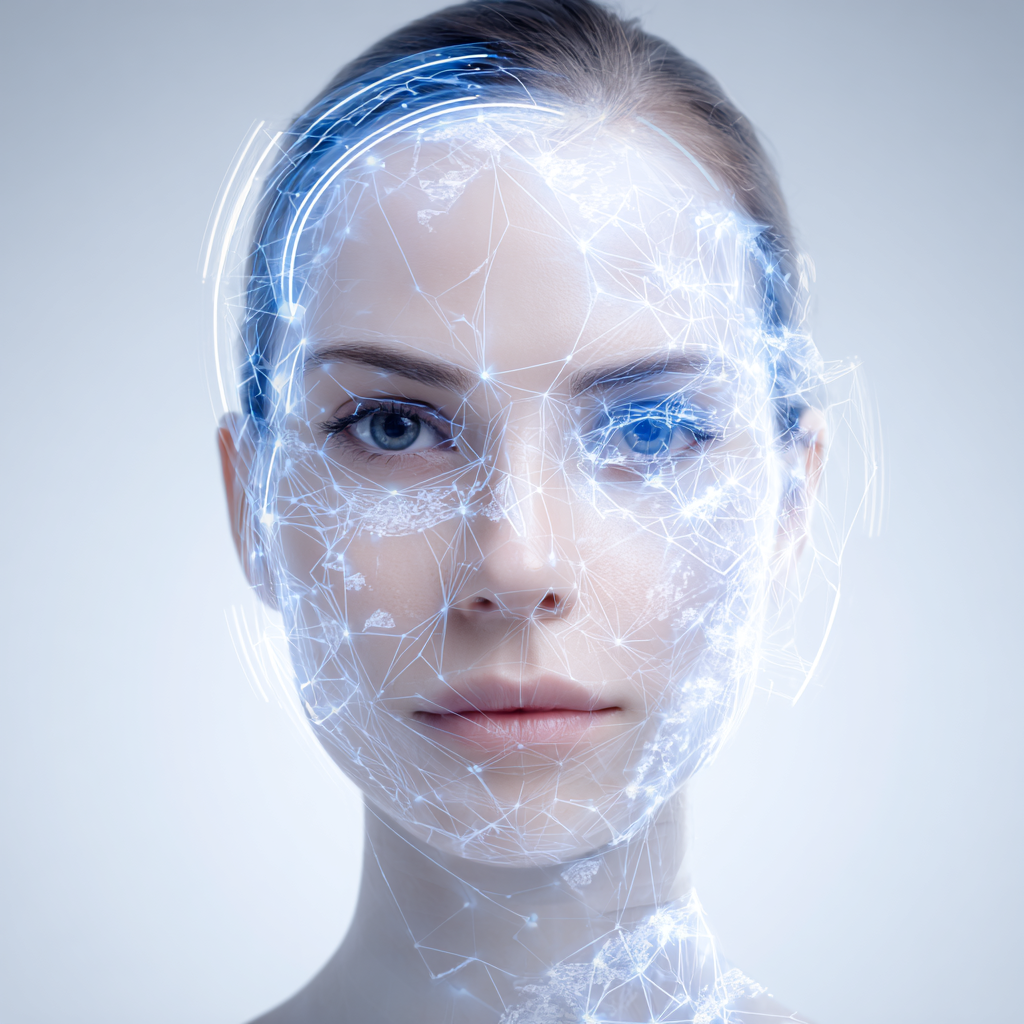 Faces that feel almost human — mapped, measured, rewritten in light. Each expression holds a quiet negotiation between softness and circuitry.