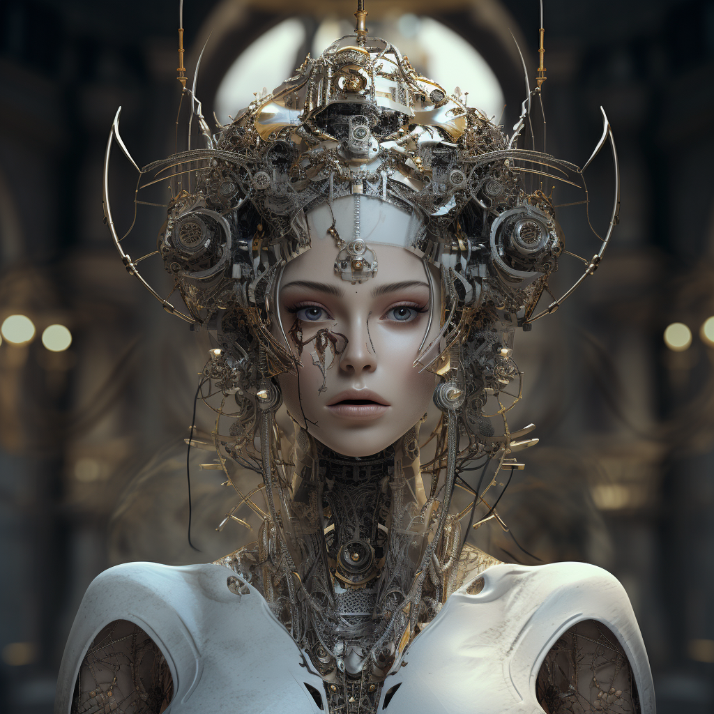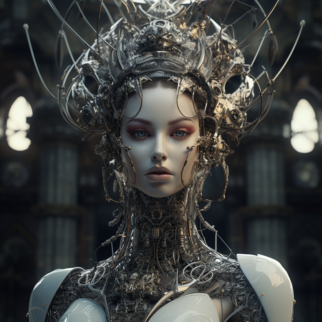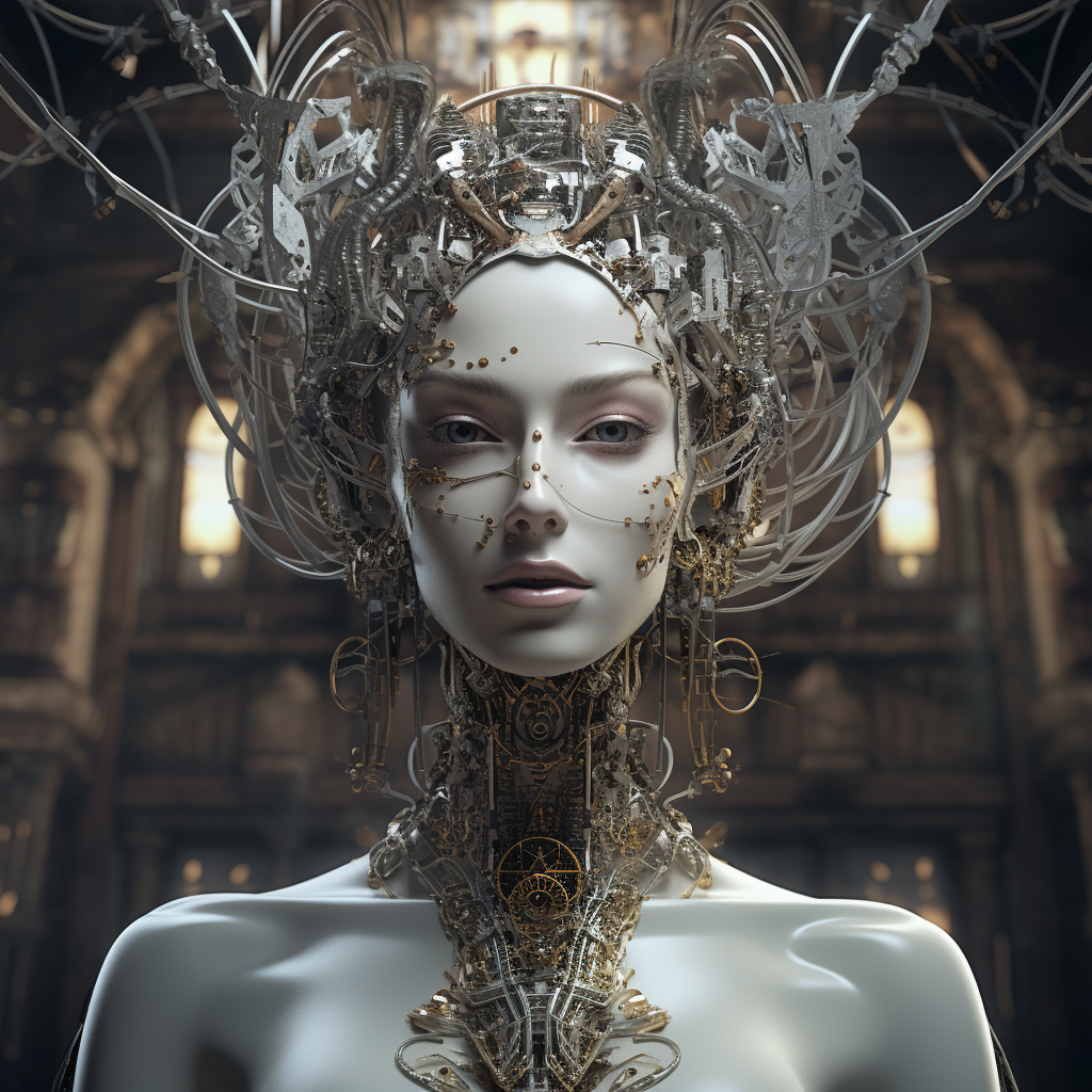 A relic of future devotion, a goddess wired for emotion she was never meant to feel.