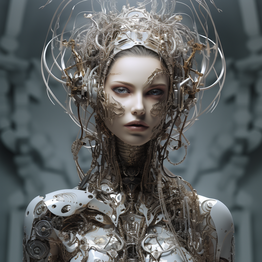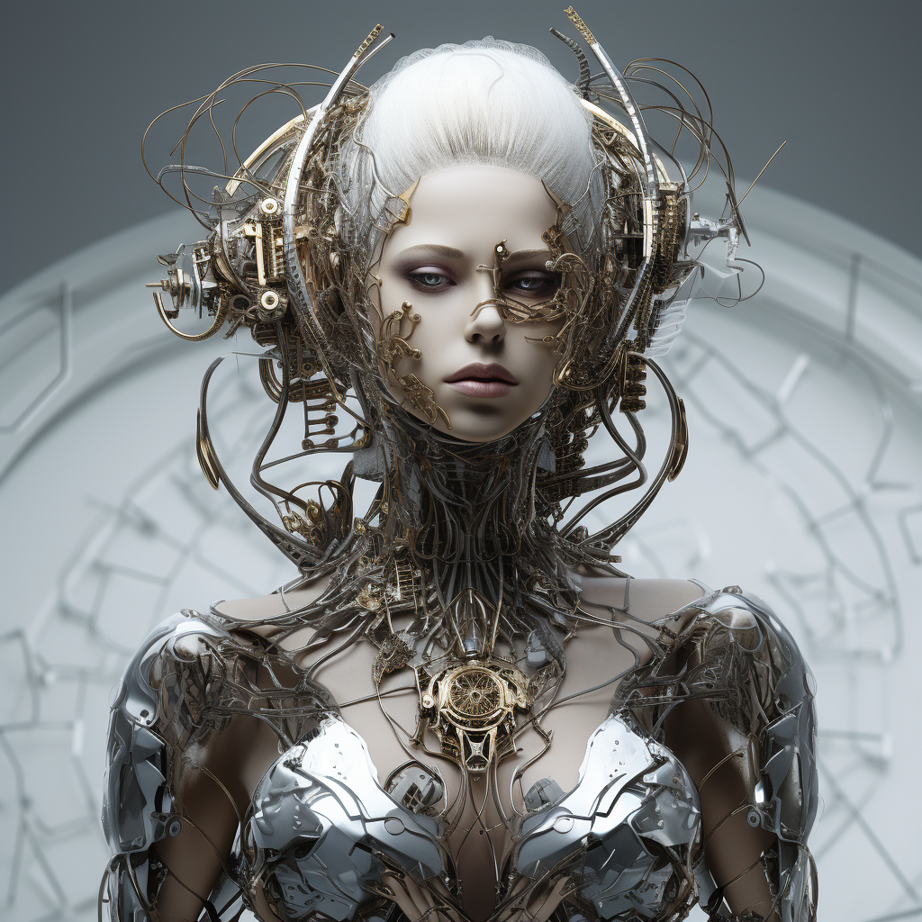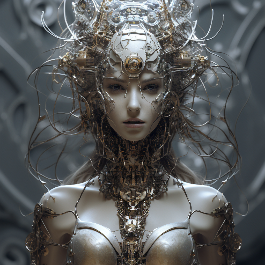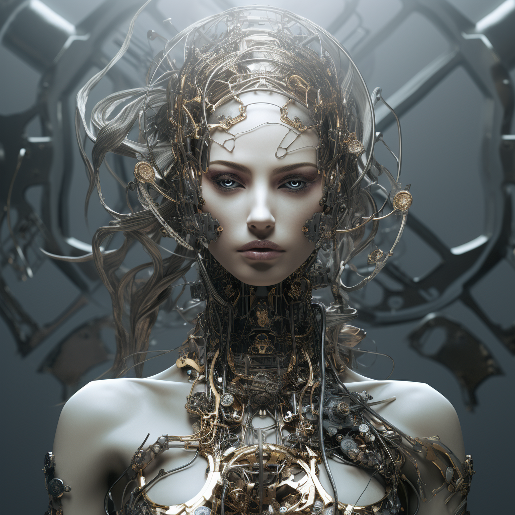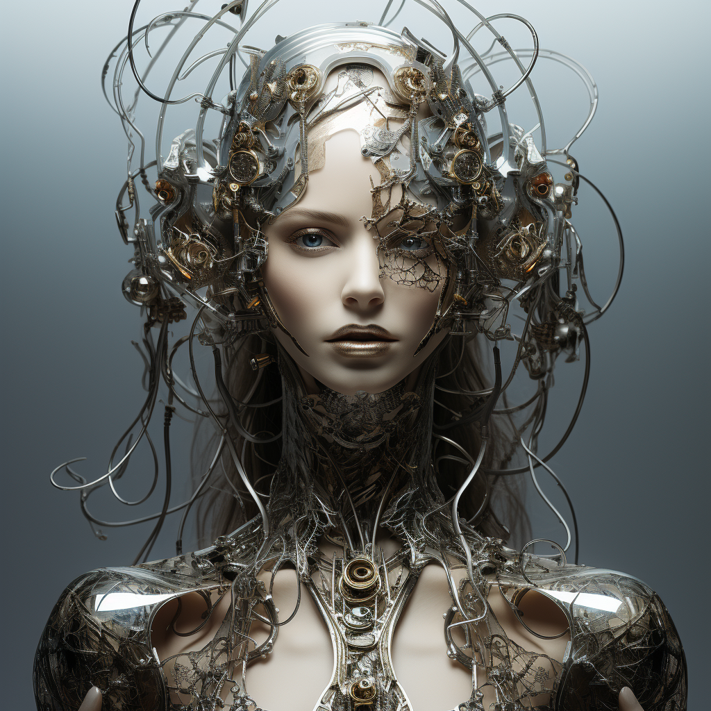 A surreal tech-inspired portrait series blending feminine form with synthetic and AI aesthetics.
