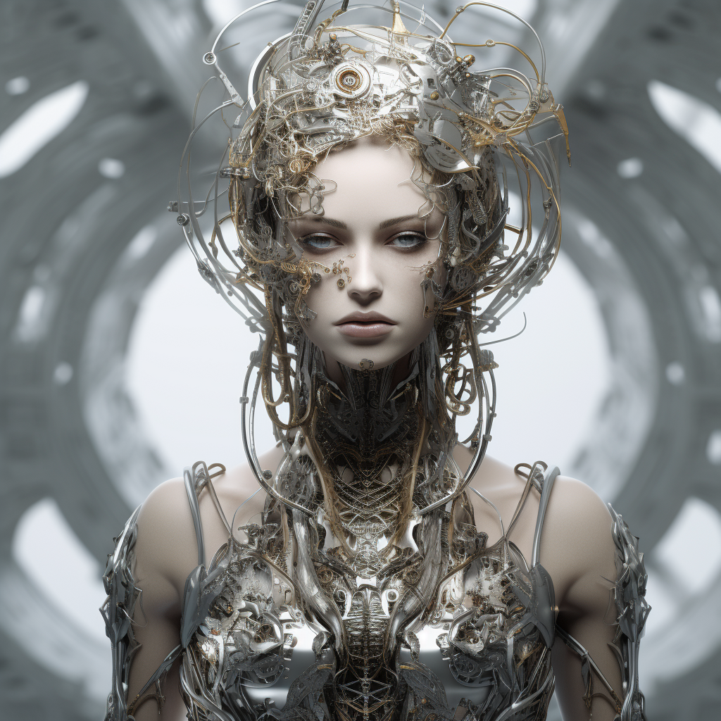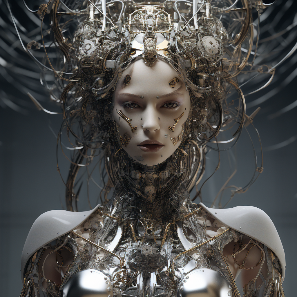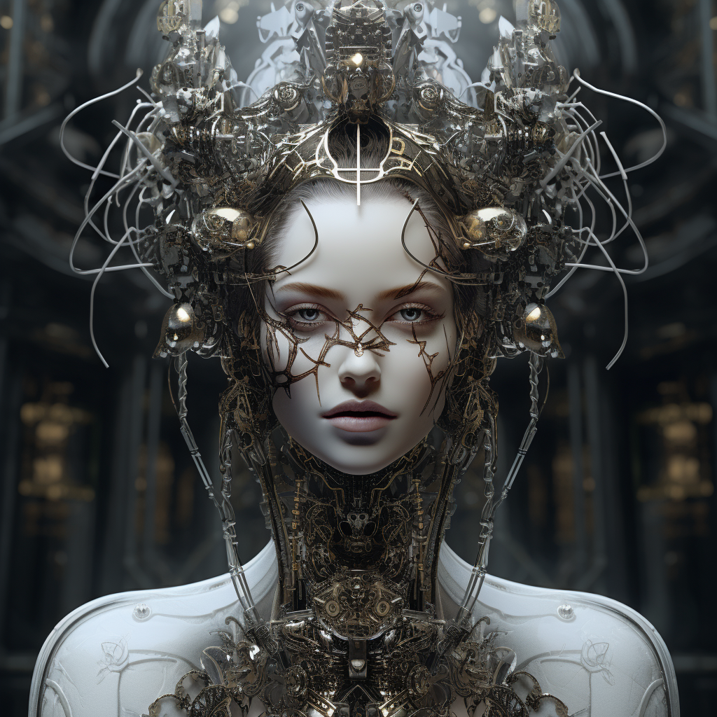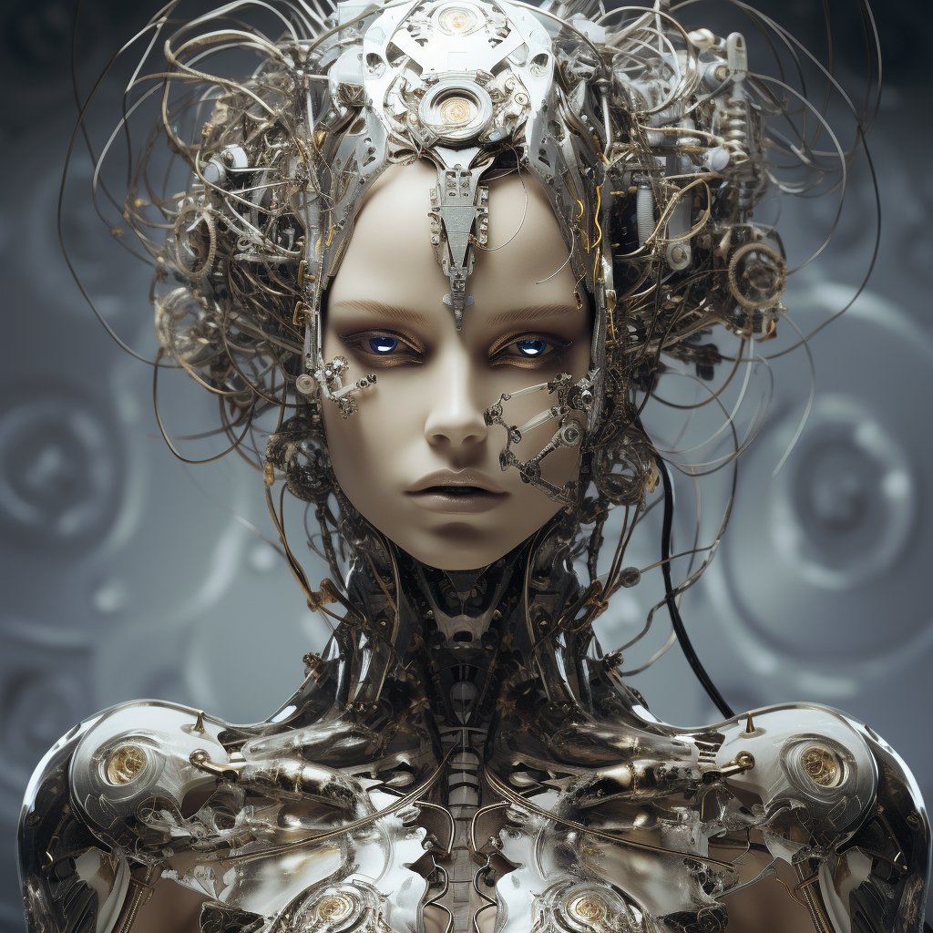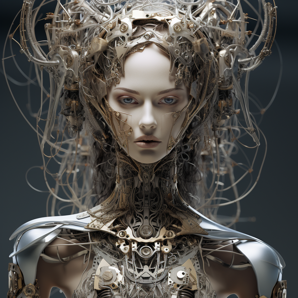 A surreal tech-inspired portrait series blending feminine form with synthetic and AI aesthetics.