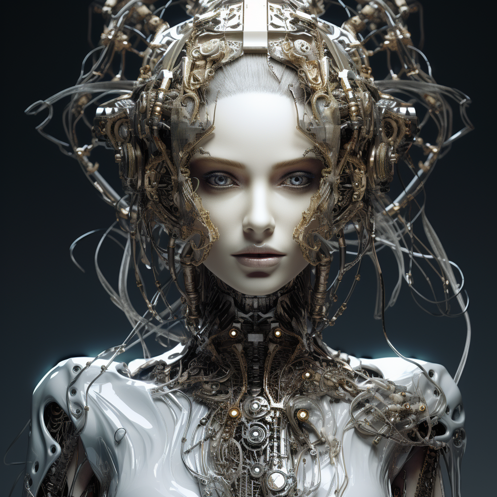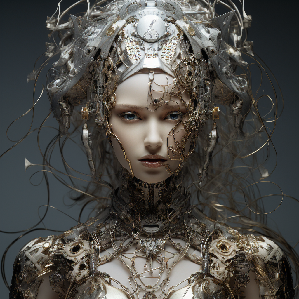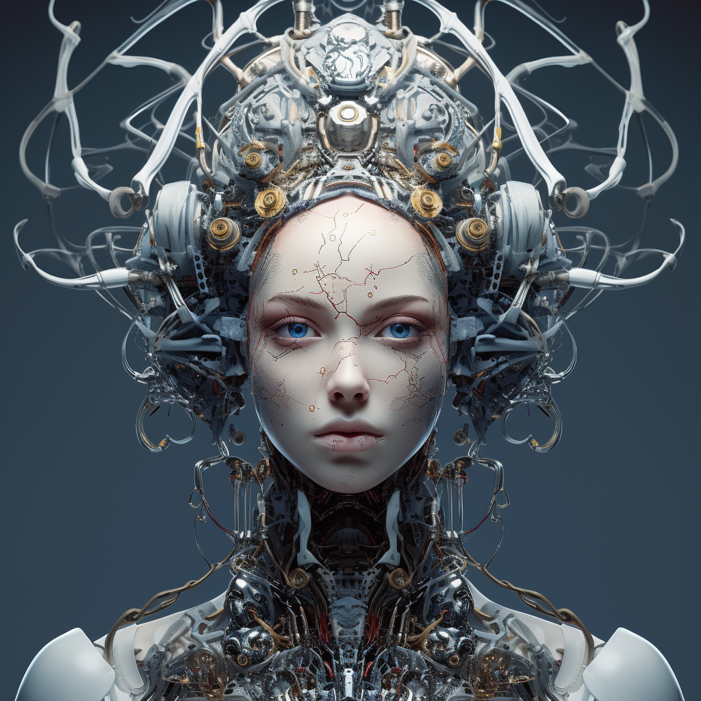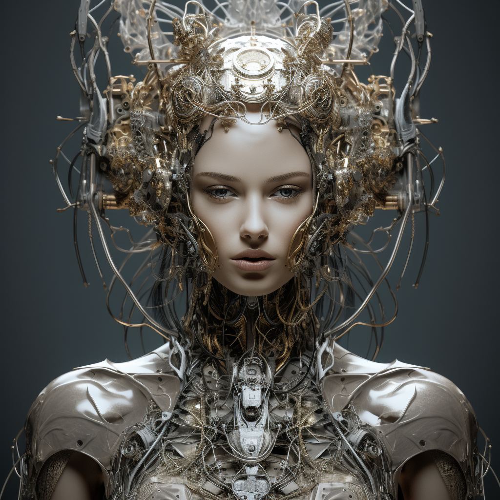A surreal tech-inspired portrait series blending feminine form with synthetic and AI aesthetics.
