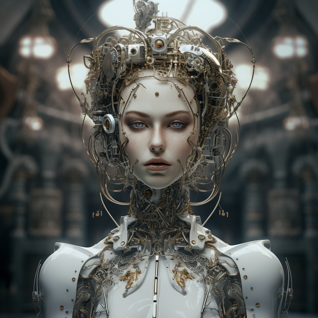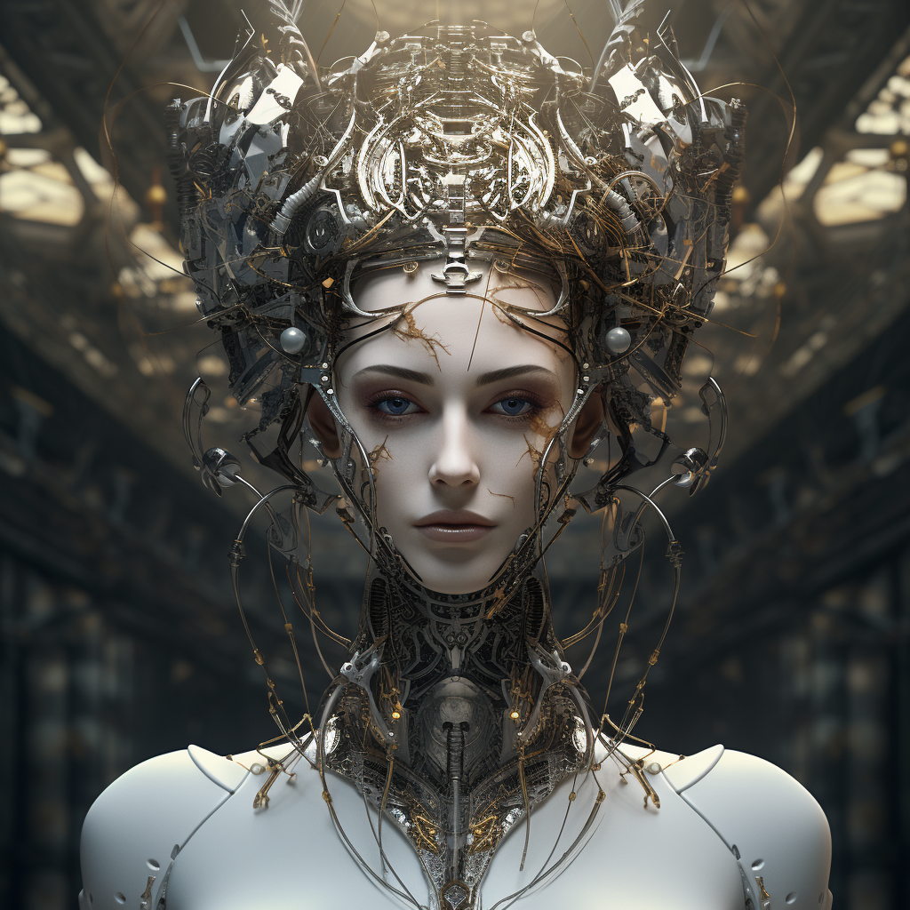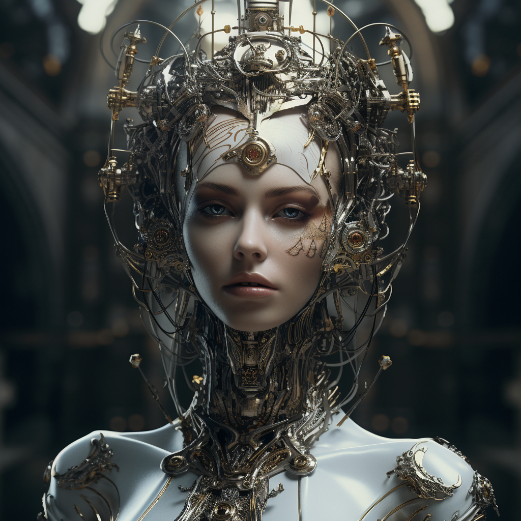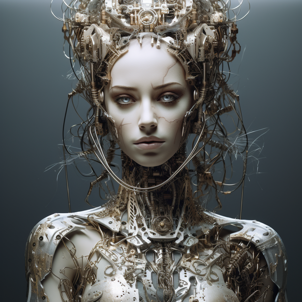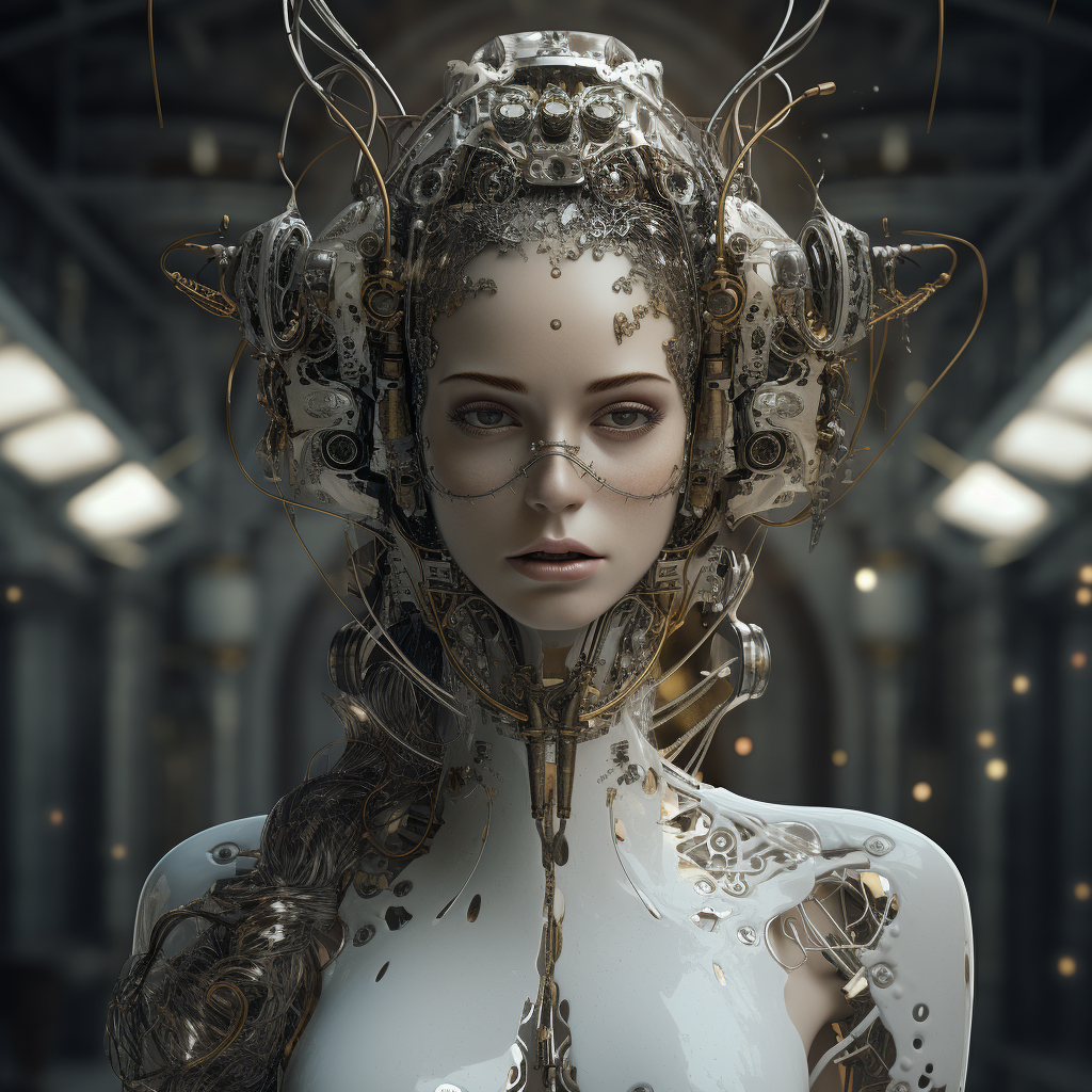 A surreal tech-inspired portrait series blending feminine form with synthetic and AI aesthetics.
