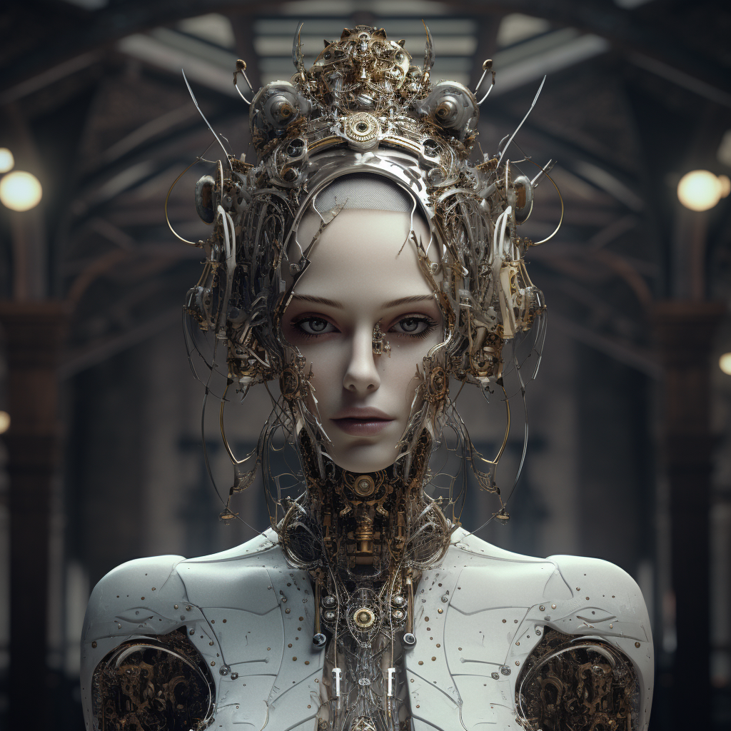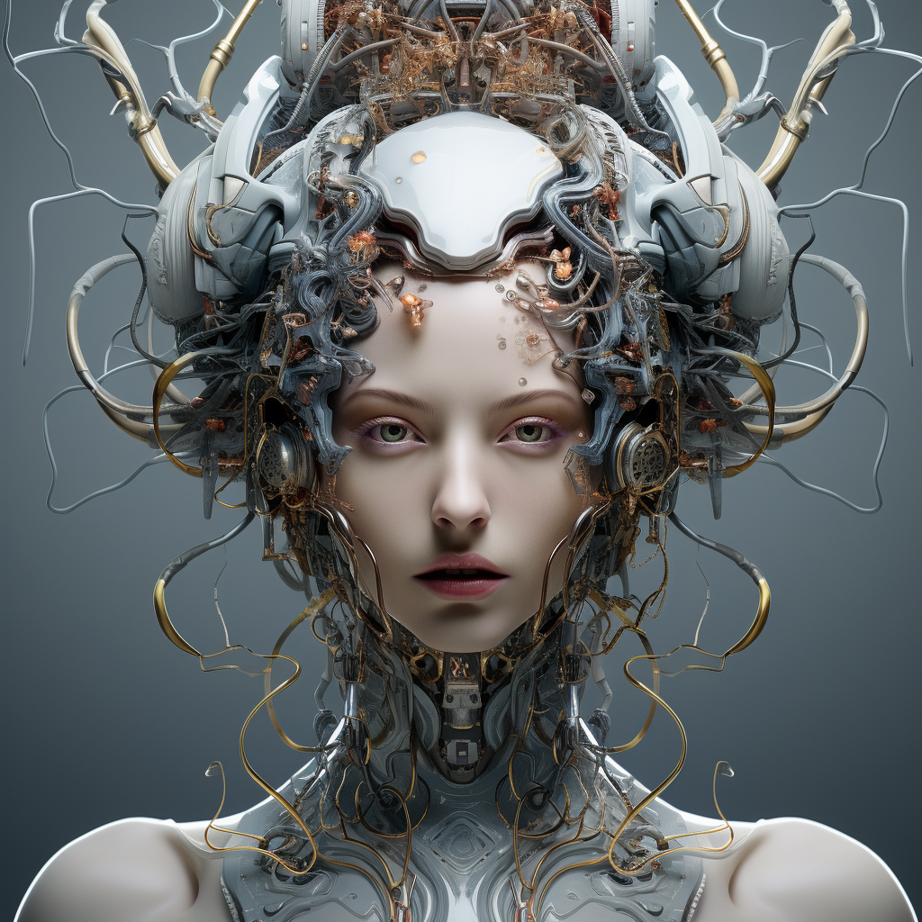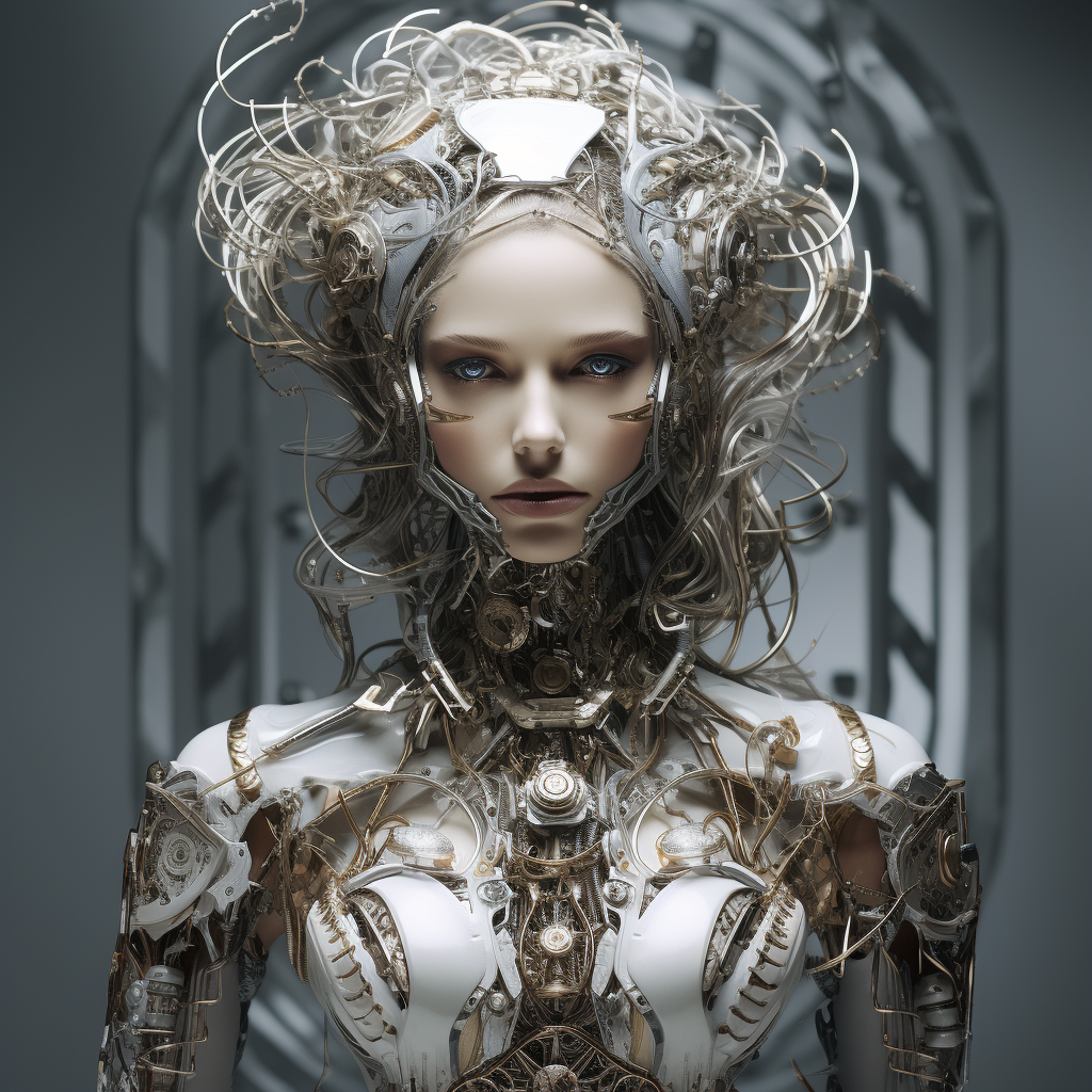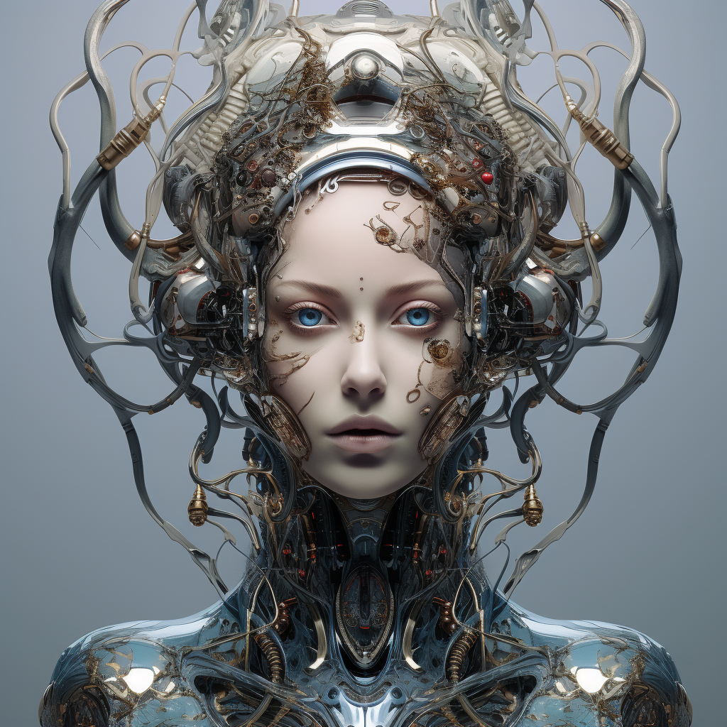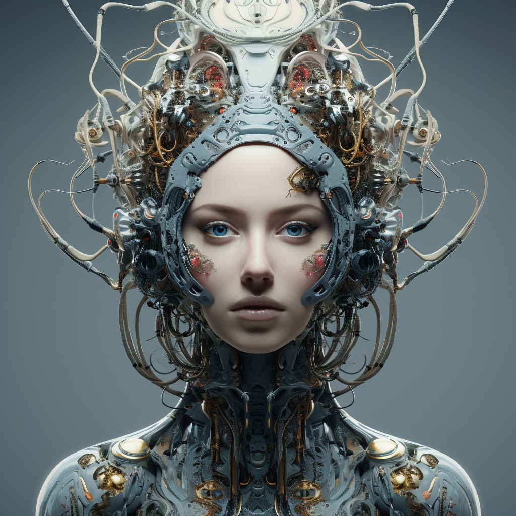 A surreal tech-inspired portrait series blending feminine form with synthetic and AI aesthetics.