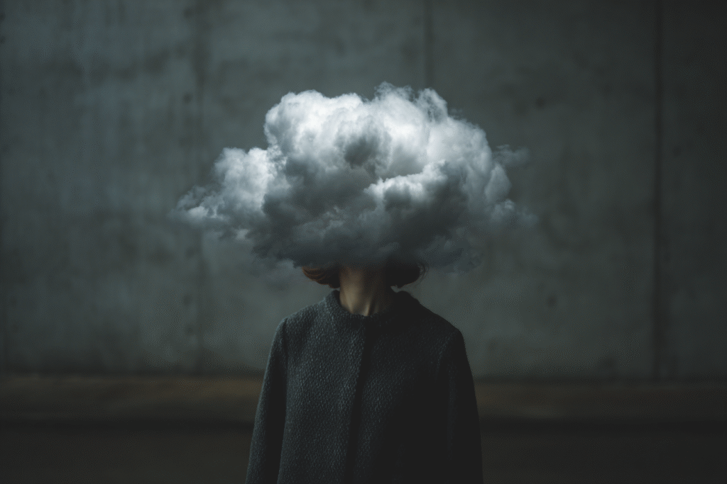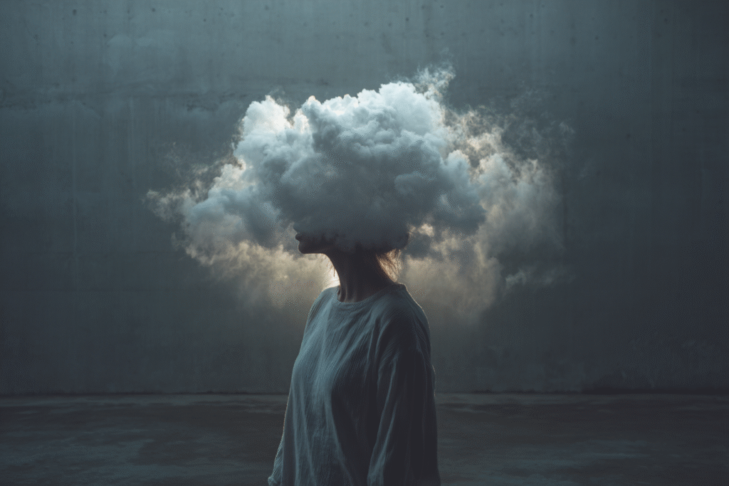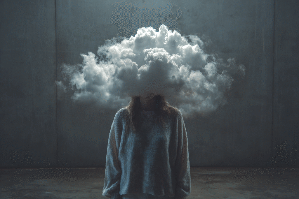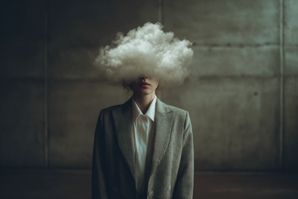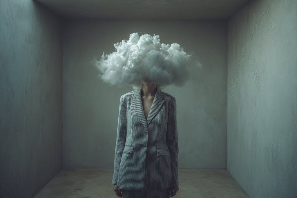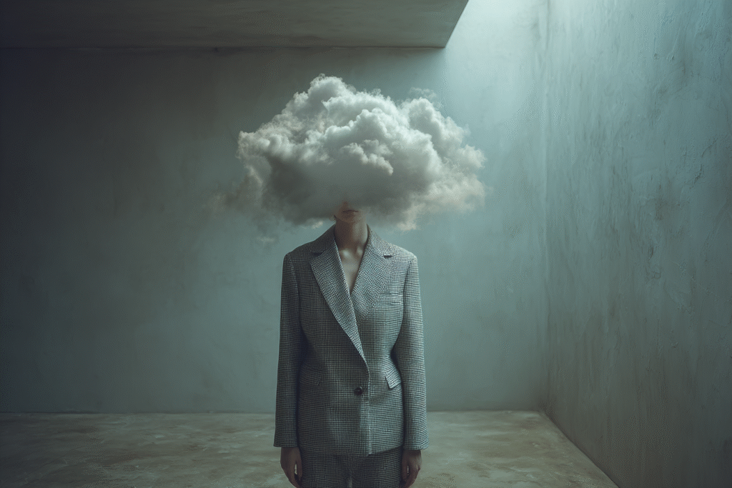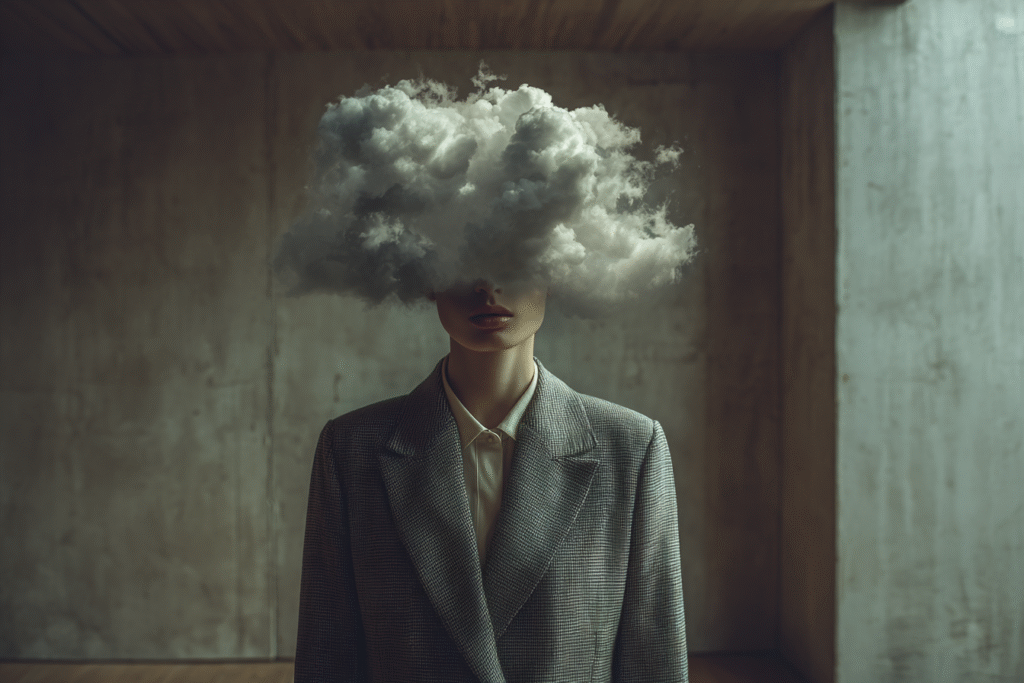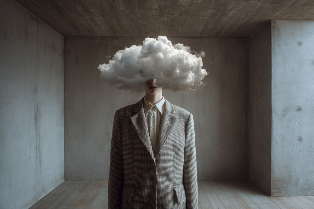A figure in tailored clothes stands motionless while a cloud forms where her face should be — soft, dense, impossible to hold. Each scene is a study of emotional weather: the heaviness we carry, the thoughts we can’t name, the quiet storms that shape us.